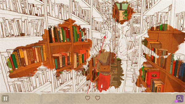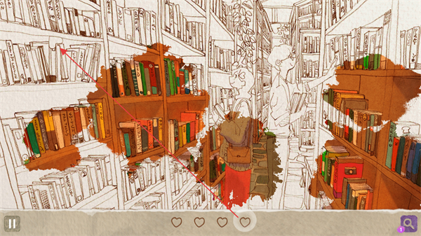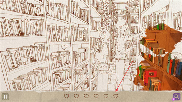 2、繼續(xù)點(diǎn)擊畫面中黑白書籍區(qū)域,填充色彩,下方愛心會隨操作減少,推進(jìn)場景還原。