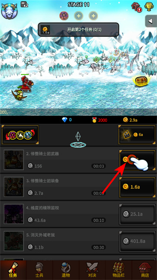 2、在任務(wù)界面,依照紅色箭頭指引點(diǎn)擊任務(wù)右側(cè)的加速按鈕,可縮短任務(wù)完成時間,獲取任務(wù)獎勵核心步驟。