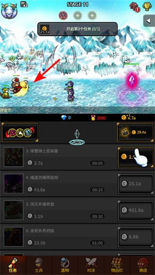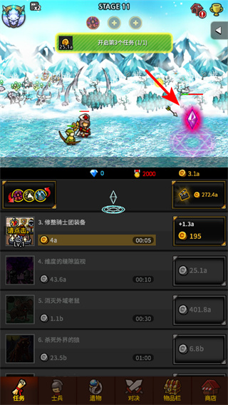 4、推進(jìn)到新關(guān)卡后,點(diǎn)擊紅色箭頭指向的紫色水晶道具,可獲取稀有資源,這是提升角色裝備等級關(guān)鍵技巧。