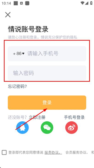 3、在情說(shuō)賬號(hào)登錄頁(yè)面填寫(xiě)手機(jī)號(hào)和密碼對(duì)應(yīng)的內(nèi)容后,點(diǎn)擊登錄完成賬號(hào)登錄操作。