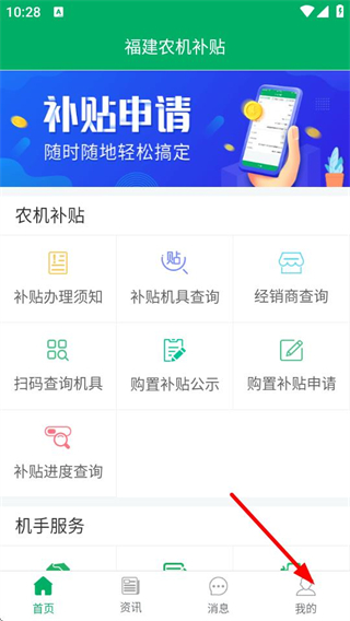 1、在福建農(nóng)機(jī)補(bǔ)貼首頁(yè),點(diǎn)擊底部導(dǎo)航欄的我的選項(xiàng),進(jìn)入個(gè)人中心頁(yè)面。