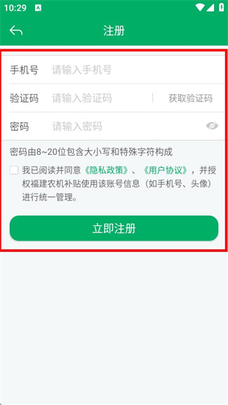 4、在注冊(cè)頁(yè)面,填寫(xiě)信息并勾選協(xié)議后,點(diǎn)擊立即注冊(cè)完成賬號(hào)注冊(cè)。
