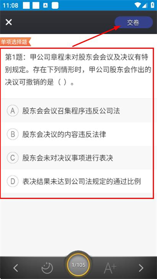 3、在模擬考試做題頁面完成題目作答后,點擊右上角的交卷按鈕,完成模擬考試。