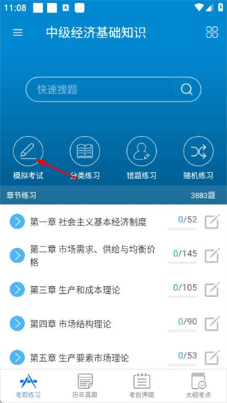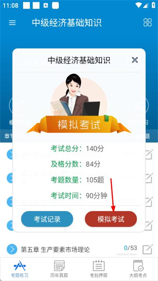 1、在考題練習頁面點擊模擬考試,彈出中級經(jīng)濟基礎(chǔ)知識的模擬考試說明窗口。