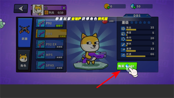4、在角色界面點(diǎn)擊購買按鈕,消耗對應(yīng)數(shù)量的鉆石如50鉆石,可解鎖新角色黃色小狗,新角色會(huì)附帶專屬屬性與技能,豐富配置。