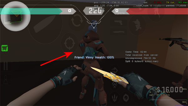 1、觀察紅色箭頭指向的Friend:Vinny標(biāo)識,該標(biāo)識會顯示隊友的生命值狀態(tài),判斷隊友的存活情況。