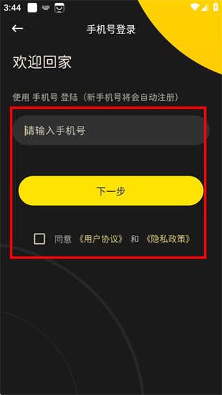 4、在手機(jī)號登錄頁面,填寫手機(jī)號并勾選協(xié)議后,點(diǎn)擊下一步按鈕。