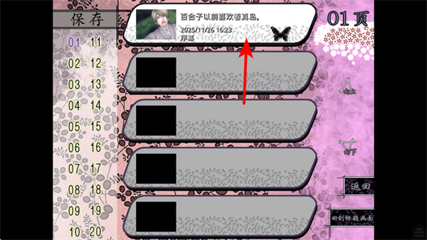 2、游戲中打開保存界面,點擊帶有信息提示的條目如百合子以前的短信信息,可查看對應(yīng)的劇情線索內(nèi)容。