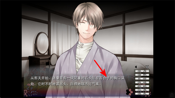 3、在劇情界面中,閱讀當(dāng)前的文本描述如沉重的石頭壓在百合子胸口,同時可通過右側(cè)選項欄互動推進(jìn)劇情。