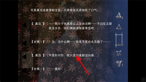 4、點擊對話界面右側(cè)的功能按鈕,可切換不同的交互選項,參與角色間的對話互動,解鎖后續(xù)劇情內(nèi)容。
