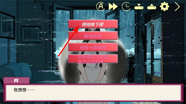4、按照箭頭指引,點擊把他推下樓選項,可選擇該劇情分支,觸發(fā)對應的場景情節(jié)變化。