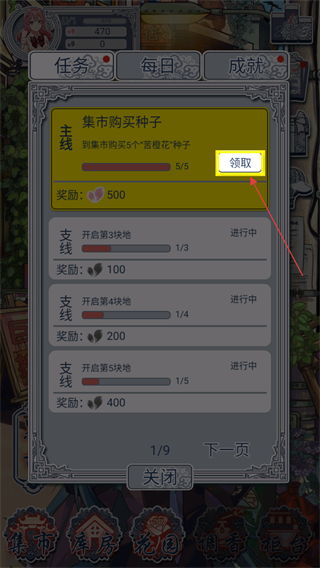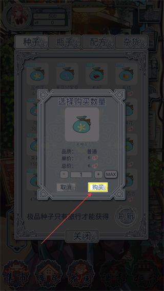 1、進入集市的種子界面,選擇要購買的種子,選定購買數(shù)量后,點擊購買按鈕,即可獲取對應(yīng)種子。
