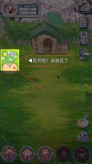 4、當花朵成熟后,點擊對應(yīng)的花朵區(qū)域,再點擊收獲按鈕,即可獲取種植產(chǎn)出的花朵。
