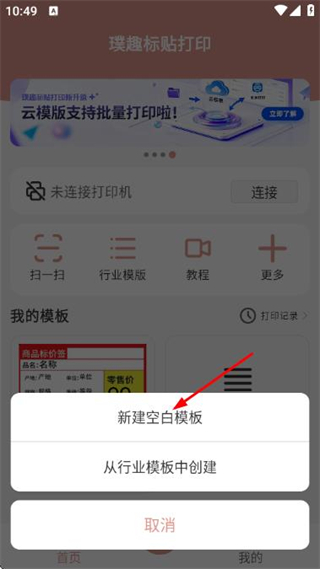 1、在璞趣標貼打印首頁點擊底部的添加按鈕,彈出模板創(chuàng)建選項菜單。