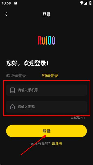 3、在密碼登錄頁(yè)面填寫手機(jī)號(hào)和密碼,點(diǎn)擊登錄按鈕完成賬號(hào)登錄操作。