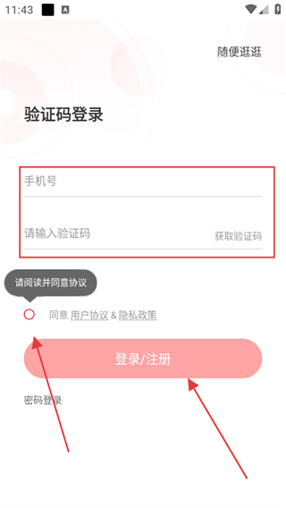 3、輸入手機號、驗證碼,勾選同意用戶協(xié)議和隱私政策,點擊登錄/注冊。