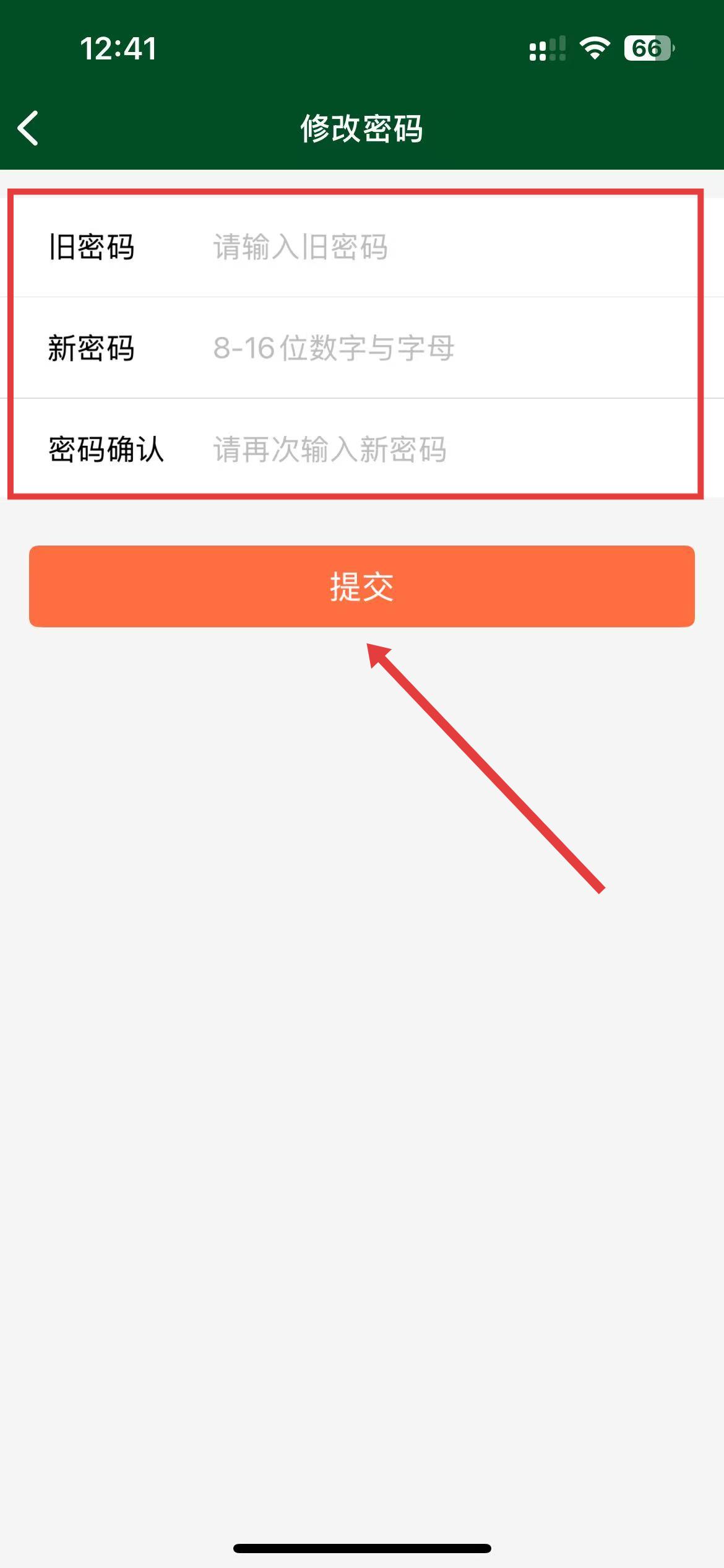 4、在修改密碼頁面,輸入舊密碼,再設置新密碼,再次輸入密碼確認,完成后點擊提交,即可成功修改密碼。