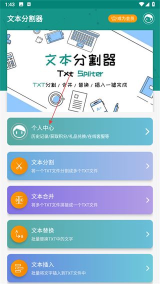 1、打開(kāi)文本分割器,點(diǎn)擊個(gè)人中心,進(jìn)入功能頁(yè)面。