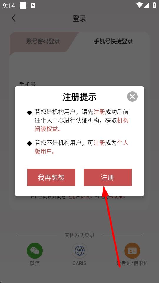 1、打開微書房app進入登錄界面,在登錄界面出現(xiàn)注冊提示彈窗,點擊注冊按鈕。