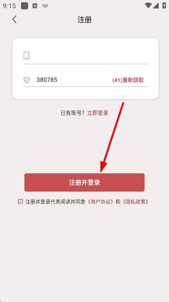 2、進入注冊頁面,輸入手機號,并獲取填寫對應(yīng)的驗證碼,確認(rèn)信息無誤后,點擊注冊并登錄按鈕。