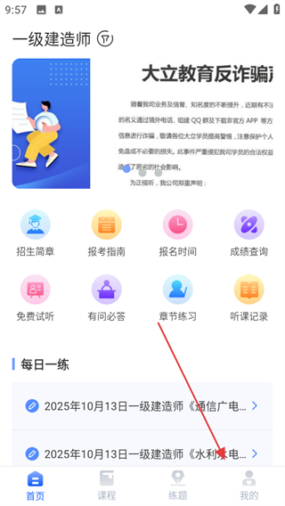 1、打開大立教育APP,進(jìn)入首頁,點(diǎn)擊底部導(dǎo)航欄中的我的選項(xiàng)。