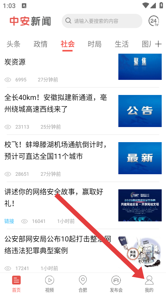 1、打開中安新聞APP,需要點擊底部我的,進入個人的界面。