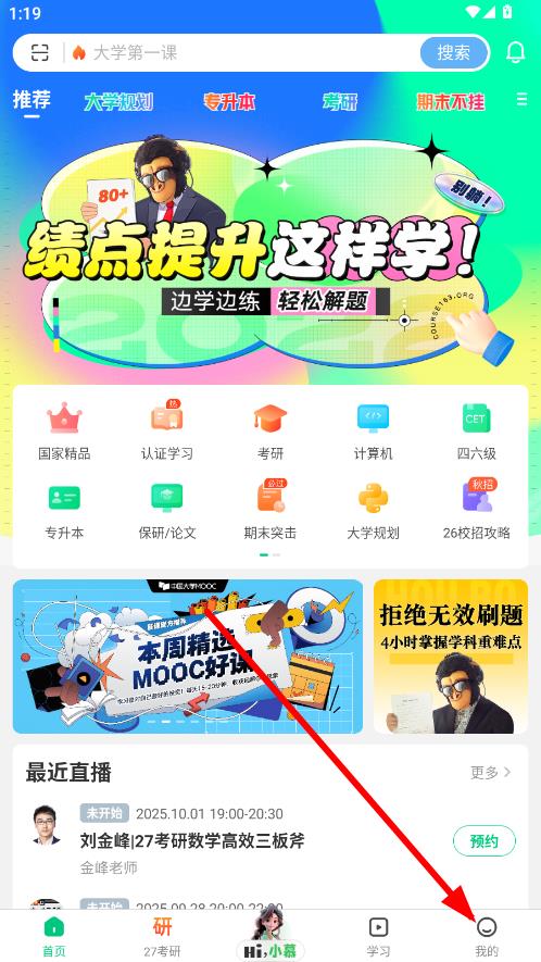 1、打開中國大學(xué)moocAPP,在首頁點(diǎn)擊我的進(jìn)入個(gè)人界面。