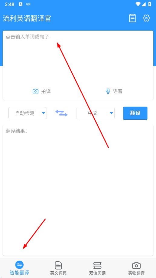 1、打開流利英語翻譯官APP,在智能翻譯界面的輸入框中,點擊輸入需要翻譯的英文單詞或句子。