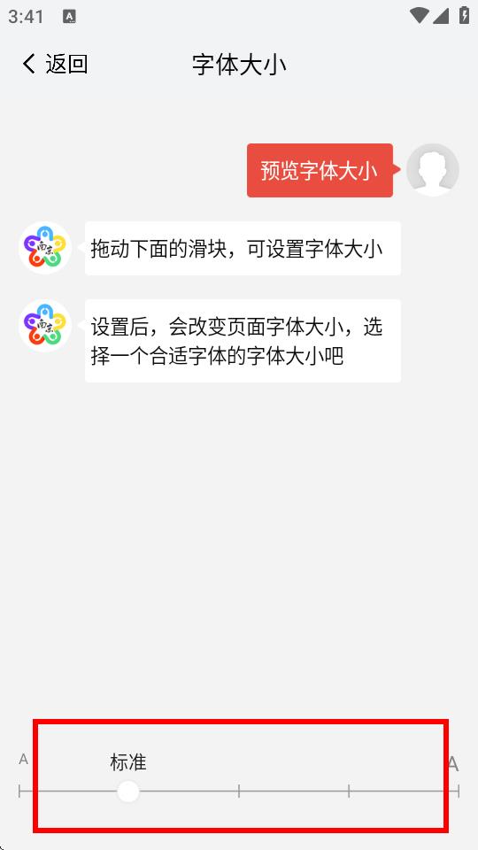 4、在字體大小設(shè)置頁面,通過拖動下方的滑塊來調(diào)整字體大小,調(diào)整后可點擊預(yù)覽字體大小查看效果。