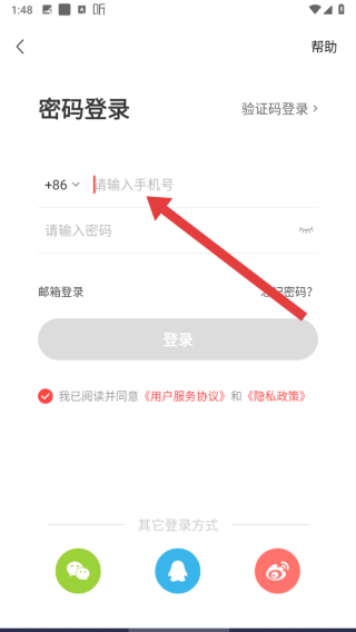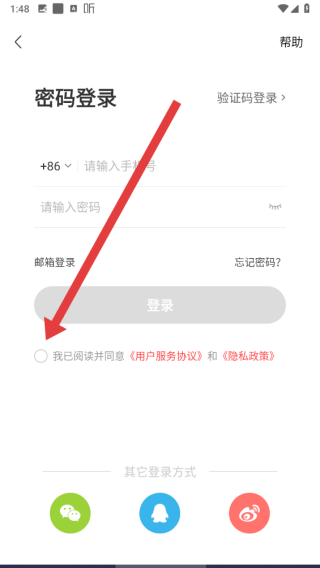 3、切換到密碼登錄頁面時(shí),需先點(diǎn)擊勾選我已閱讀并同意按鈕。