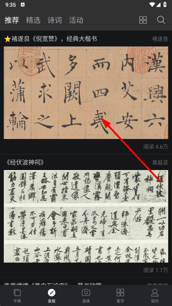 2、在發(fā)現(xiàn)頁面,選擇并點擊想要查看的書法作品,進入該作品的詳情頁面。