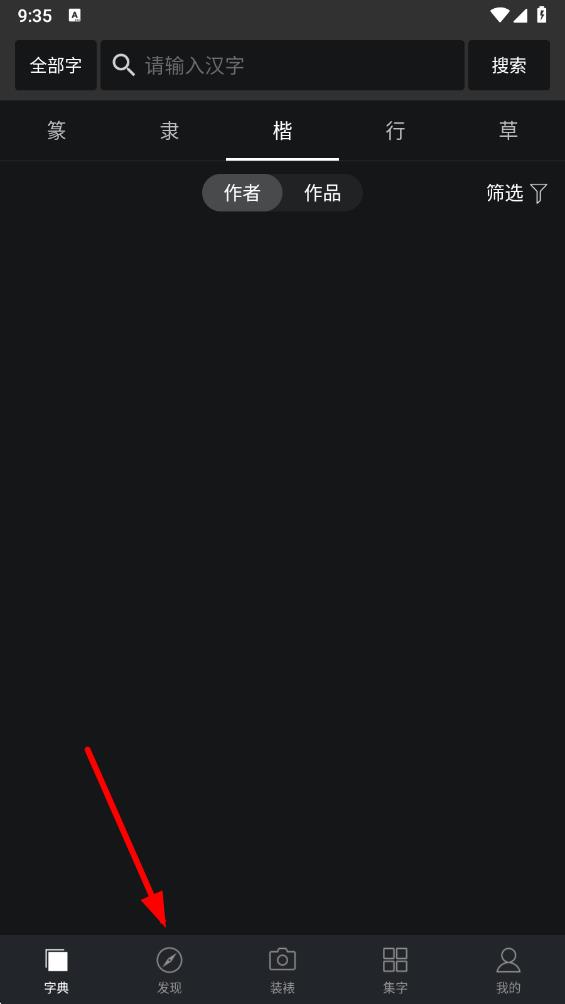1、打開書法字典大全app,點擊底部導航欄中的發(fā)現(xiàn),進入頁面。