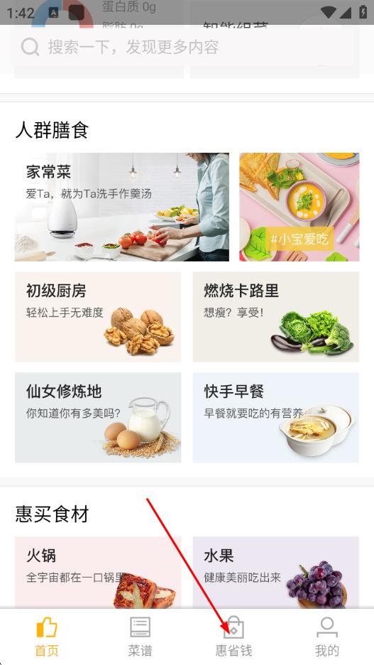 1、打開(kāi)嘉肴健康美食菜譜App,點(diǎn)擊底部導(dǎo)航欄中的惠省錢選項(xiàng)。