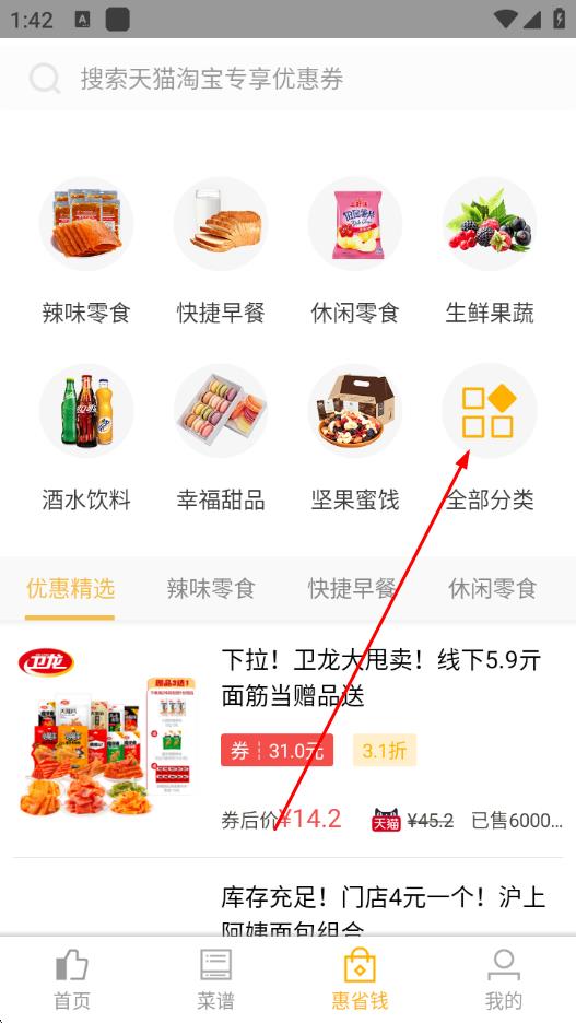 2、進(jìn)入“惠省錢”頁(yè)面后,點(diǎn)擊右上方的全部分類圖標(biāo),查看所有商品分類。