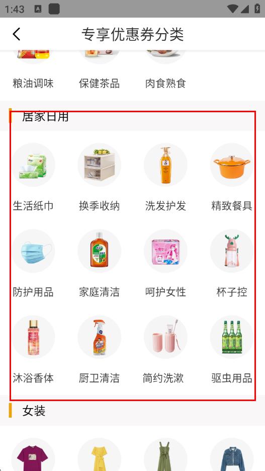 3、在專享優(yōu)惠券分類頁(yè)面,找到想要購(gòu)買商品所屬的分類,比如居家日用,點(diǎn)擊進(jìn)入。