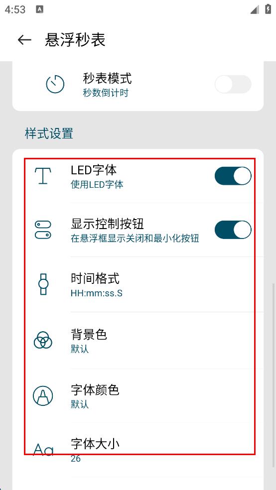 4、開啟懸浮后,在懸浮秒表設置頁面,對LED字體、顯示控制按鈕、時間格式等樣式進行設置即可。