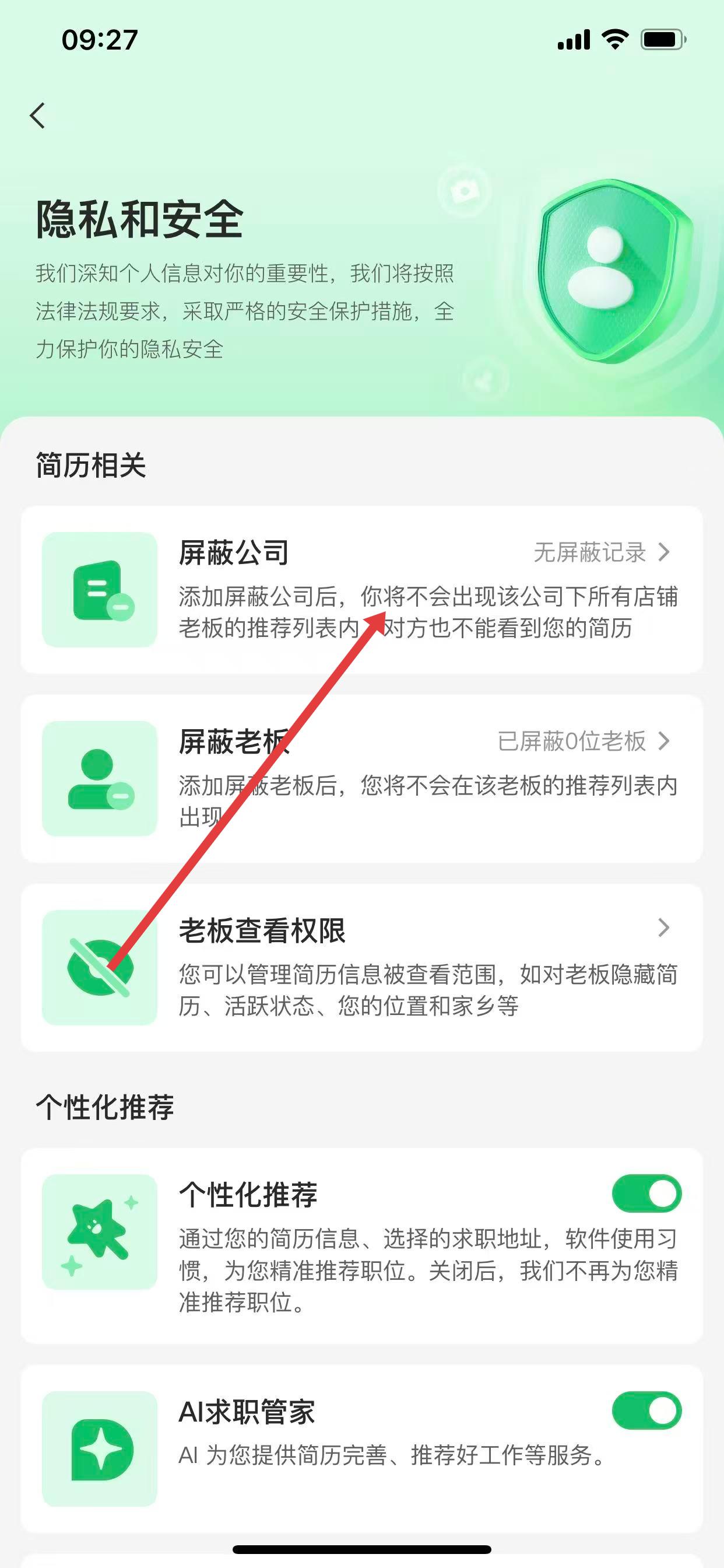 4、在隱私和安全頁面里,點(diǎn)擊屏蔽公司。