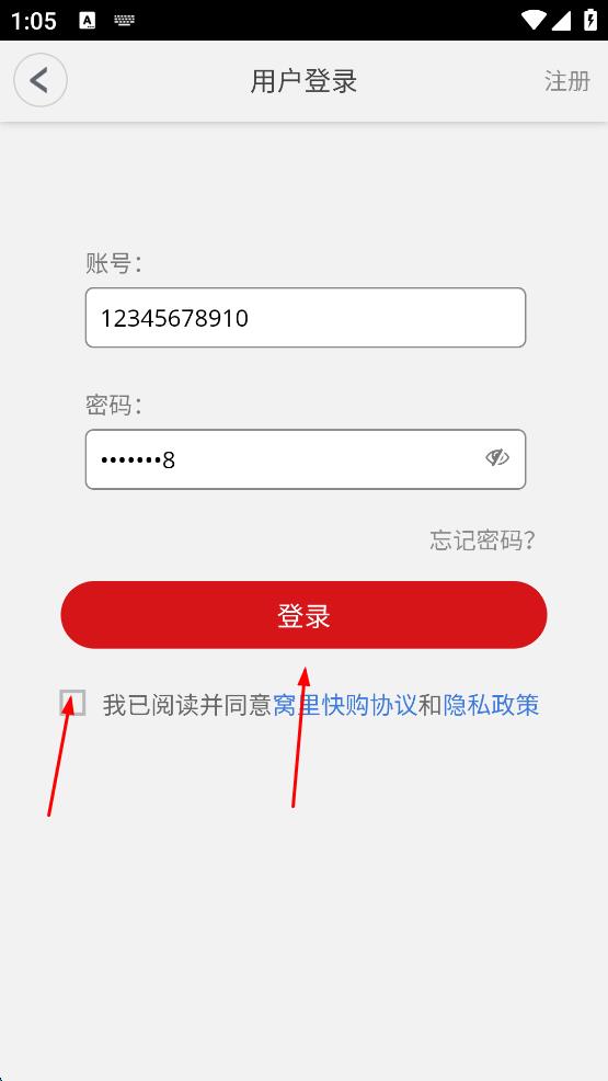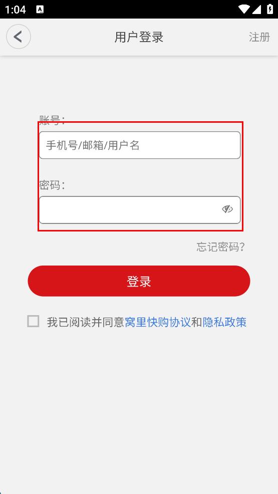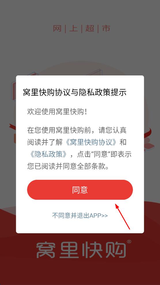 1、打開(kāi)窩里快購(gòu)App,出現(xiàn)協(xié)議與隱私政策提示彈窗,閱讀后點(diǎn)擊同意按鈕。