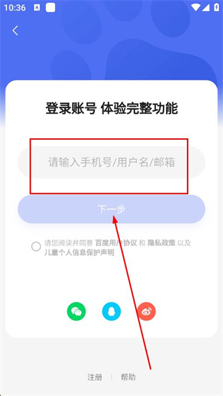 3、進(jìn)入登錄賬號頁面,填寫手機(jī)號,點擊下一步。