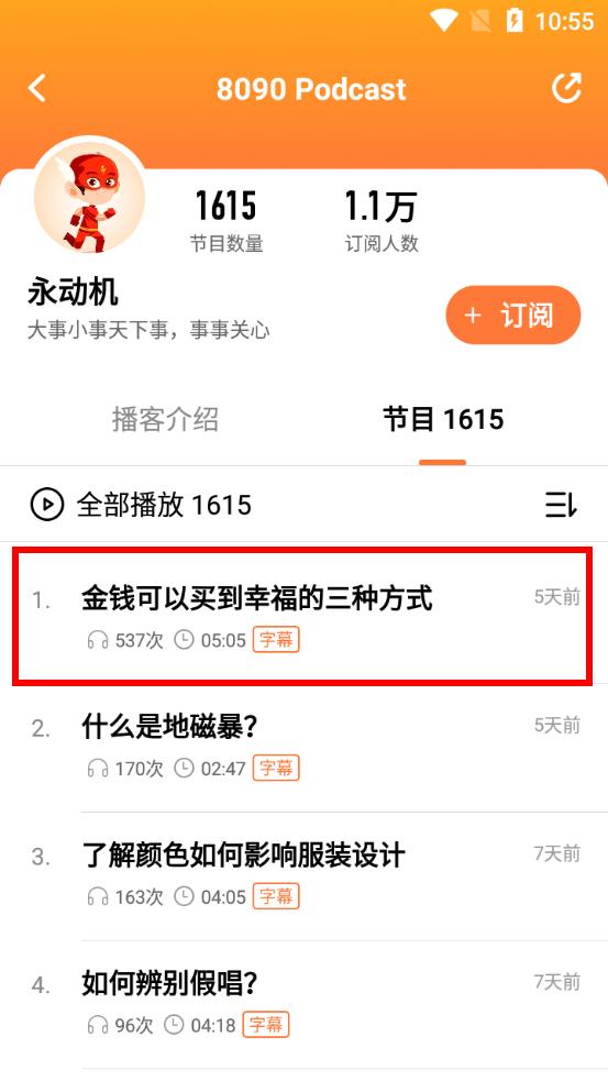 3、進(jìn)入所選播客頁面后,瀏覽節(jié)目列表,點(diǎn)擊想收聽的節(jié)目,比如金錢可以買到幸福的三種方式。