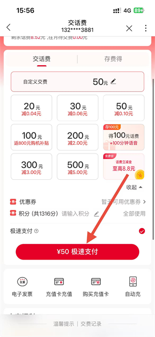 4、選擇好金額后,點擊極速支付按鈕,完成話費充值操作。