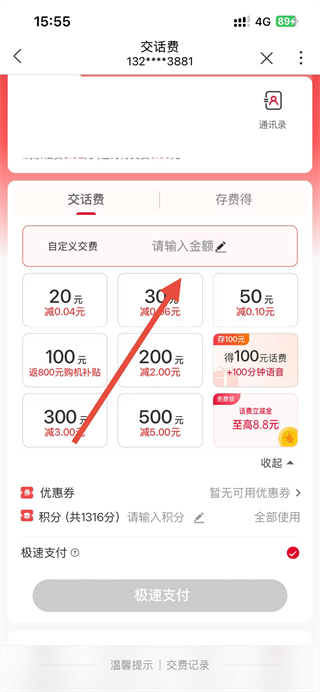 3、在交話費頁面,選擇自定義交費金額或預(yù)設(shè)金額選項。