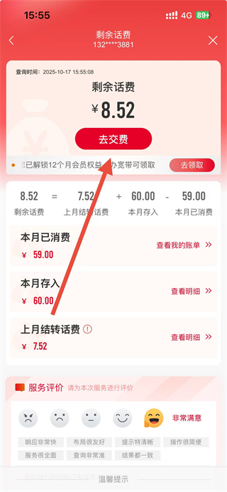 2、進(jìn)入剩余話費頁面后,點擊去交費按鈕。