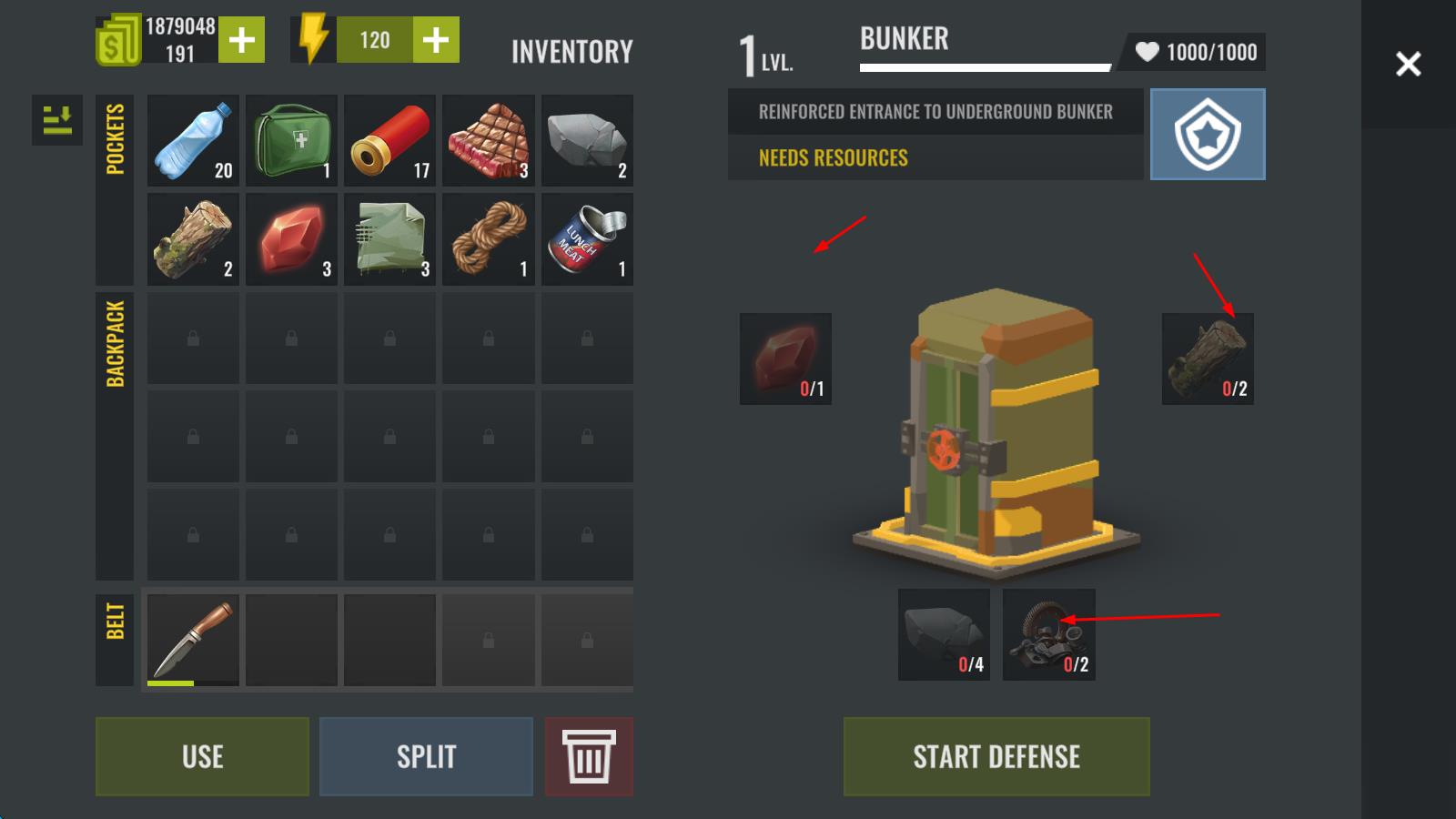 2、進入倉庫界面,查看地堡升級所需資源,從背包中選取對應材料,為地堡防御做準備。