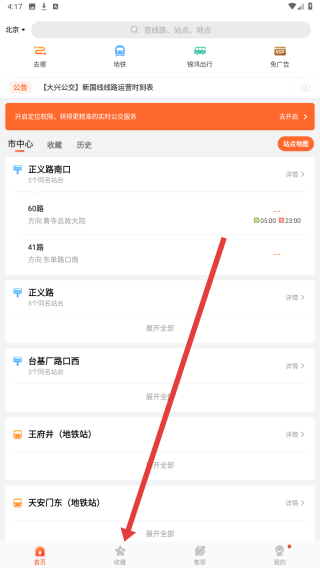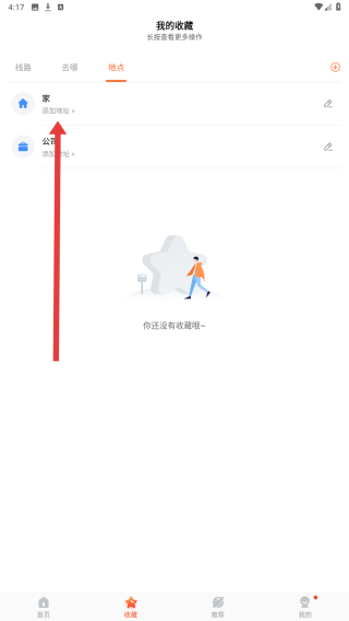 1、在公交應(yīng)用首頁點擊底部收藏按鈕,進(jìn)入我的收藏頁面,可查看已保存添加的地點信息,方便后續(xù)快速調(diào)用。