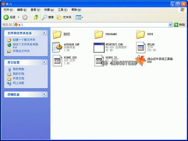 成功后,你的U盤(pán)里就有了類(lèi)似于一下文件目錄,你可別把它們刪除了哦。(各個(gè)PE系統(tǒng)不同,所以文件與目錄也不盡相同)U盤(pán)文件