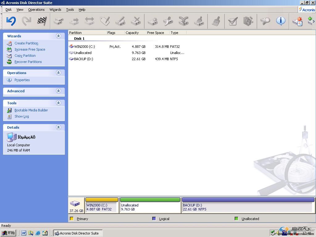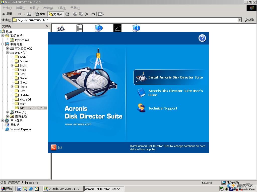 我當時使用的操作系統(tǒng)是Windows 2003,由于該軟件不能運行在該系統(tǒng)下,所以用光盤將系統(tǒng)Ghost回Windows 2000(數(shù)據(jù)備份功夫還不錯吧,呵呵),運行安裝Acronis Disk Director Suite 10.0,如圖2。