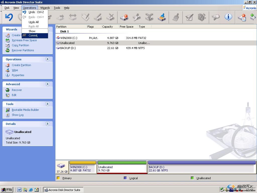 可能是軟件尚未對硬盤分區(qū)進行修改,于是回到軟件里面,在Operations下運行Commit(即提交修改),圖14。
