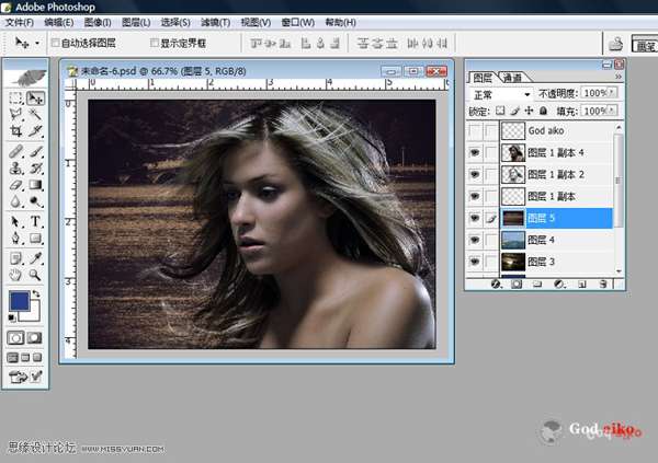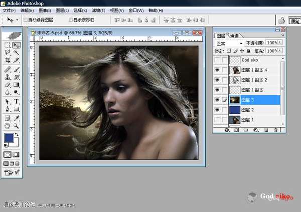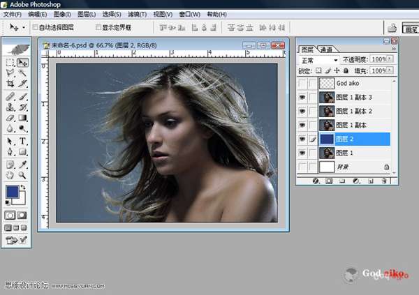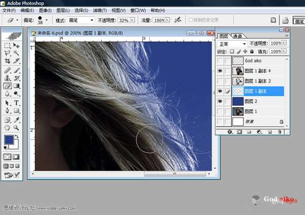 06 以此選擇“圖層副本1-2”放大圖片,利用“工具面板”相關(guān)工具修正頭發(fā)邊緣不干凈雜點(diǎn)及頭發(fā)局部細(xì)化,(這一步非常重要,耐心是基礎(chǔ))