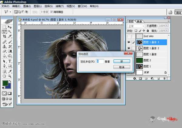 04 選擇“圖層副本4”,執(zhí)行工具面板里的“多邊形套索工具”選取人物主體比分,執(zhí)行“選擇--羽化”命令